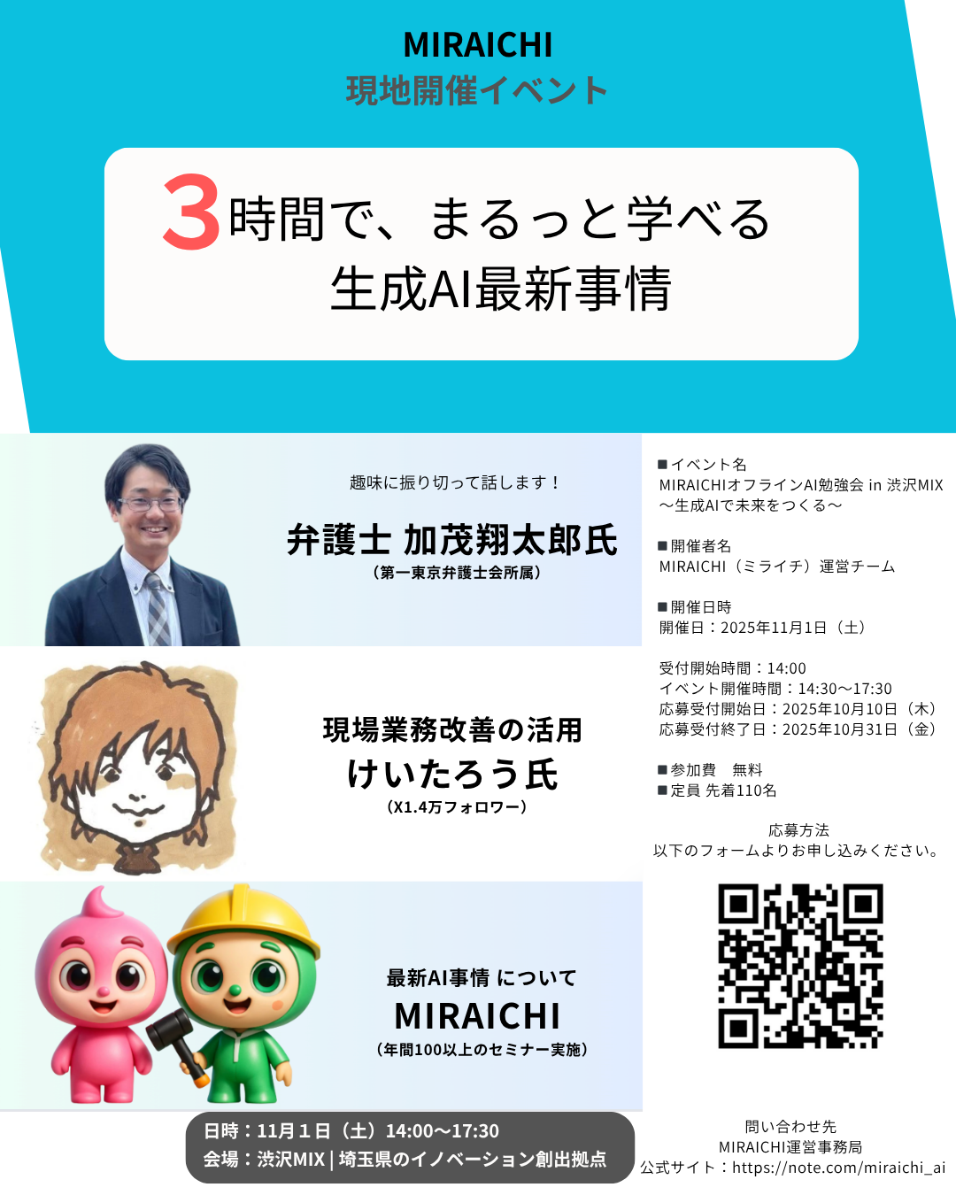 | 問い合わせ先 | MIRAICHI運営事務局 公式サイト:https://note.com/miraichi_ai |