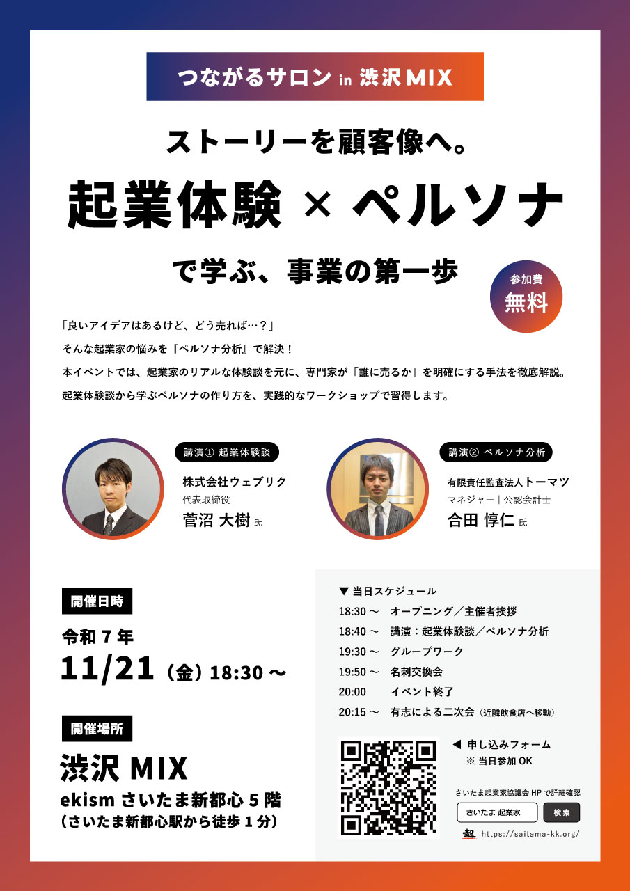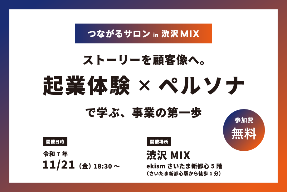 | 対象者 | ・埼玉県内での起業を検討中または関心を有する方 ・創業間もない経営者およびスタートアップ関係者 ・企業の新規事業担当者 ・マーケティングの基礎(特にペルソナ設定)について学びたい方 |