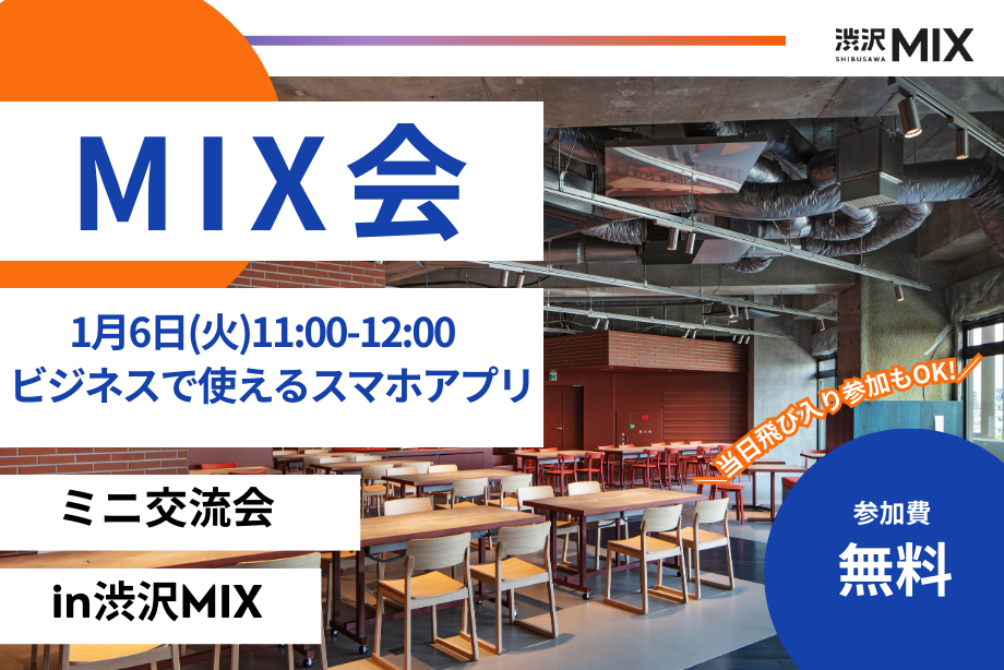 | イベント内容 | 肩書きや業種を越えて“まじりあう”ことをテーマにした、渋沢MIX主催のミニ交流会。 簡単な自己紹介タイムやテーマトークを交えながら 自由な対話や情報交換を楽しめる場として開催します。 コミュニティーマネージャーが中心となって、小人数制で会員様同士の交流をサポートします。 今回は「ビジネスで使えるスマホアプリ」 「あのアプリ、どう使ってる?」「〇〇機能が便利!」など、みなさんが実践しているスマホアプリの活用法をカジュアルに共有し合いましょう。会員さん同士の具体的な事例を知り、事業を加速させるヒントを、気軽な気持ちで見つけに来てください! |