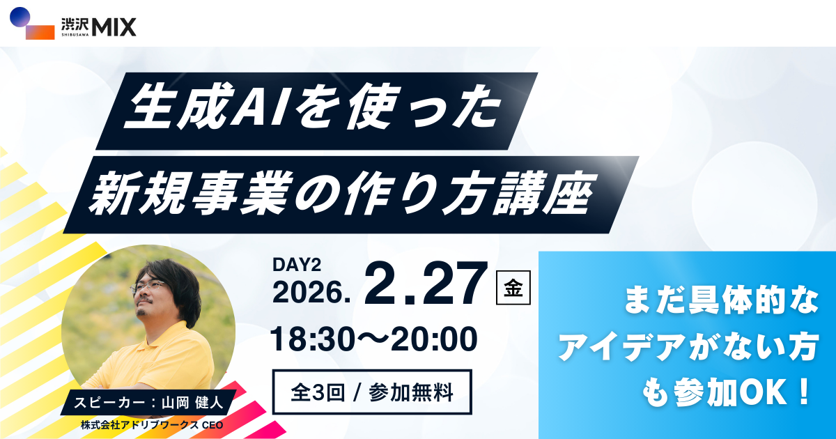 | 日時 | D DAY2「ビジネスプラン設計図の作り方」 2026年2月27日(金) DAY3「事業企画の作り方〜発表」 2026年3月13日(金) イベント開催時間:18:30〜20:00 受付開始時間:18:00 |